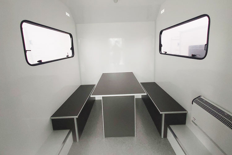 The mobile office trailer is constructed using FRP (GRP)–reinforced insulated foam core sandwich panels.This composite structure provides outstanding thermal insulation, sound insulation, and structural strength, greatly improving indoor working comfort.