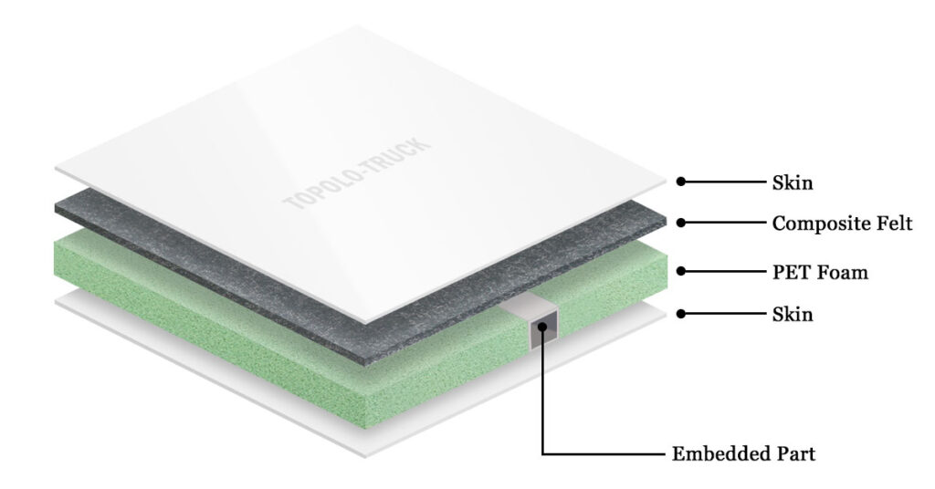 Structural strength is improved by adding energy-absorbing felt layers and internal embedded parts. Suitable for vehicle bodies requiring high structural strength.
