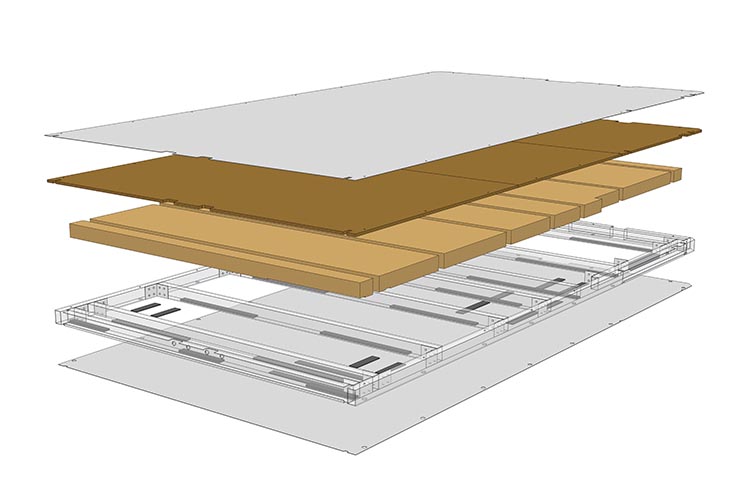 Une couche de contreplaqué haute résistance et imperméable est intégrée pour renforcer la rigidité et la capacité de charge du plancher. Conçu pour résister aux charges concentrées des chariots élévateurs, palettes et roll-conteneurs lors des opérations fréquentes de chargement et de déchargement, il minimise les déformations et la fatigue à long terme.